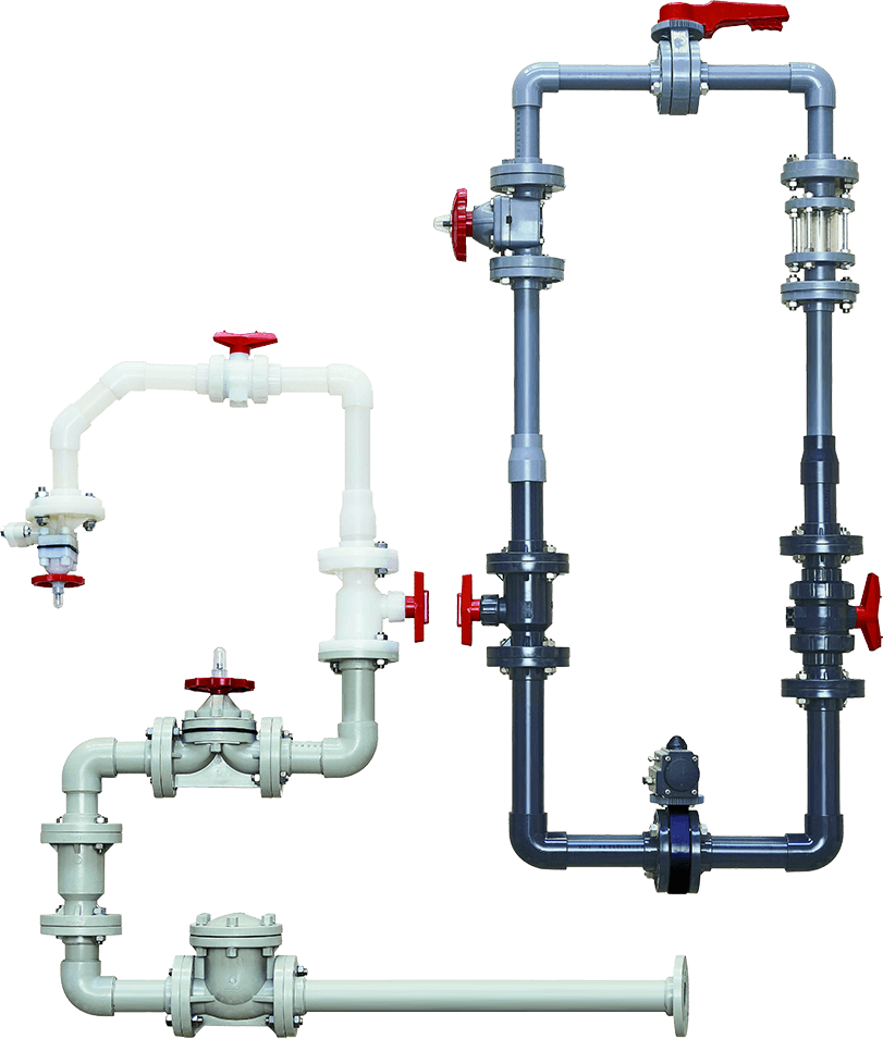 閥門系列產品如:隔膜閥、蝶閥、球閥、截止閥、止回閥、耐腐蝕泵等。主要材質有CPVC、UPVC、PVDF、PPH、FRPP等。